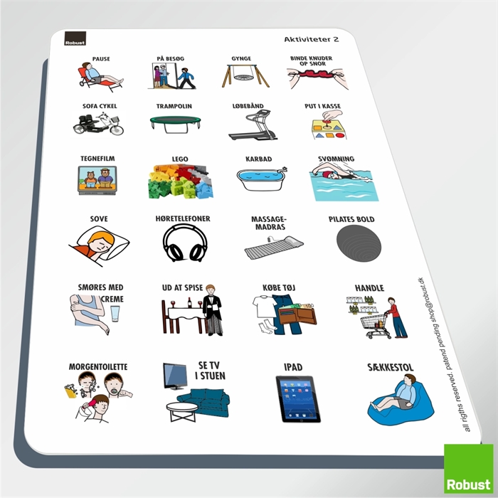 BEMÆRK: de enkelte piktogrammer er alle monteret med en velcropude på bagsiden, lige til at trække af piktogramarket, og bruge på din Robust tavle eller ugeplan