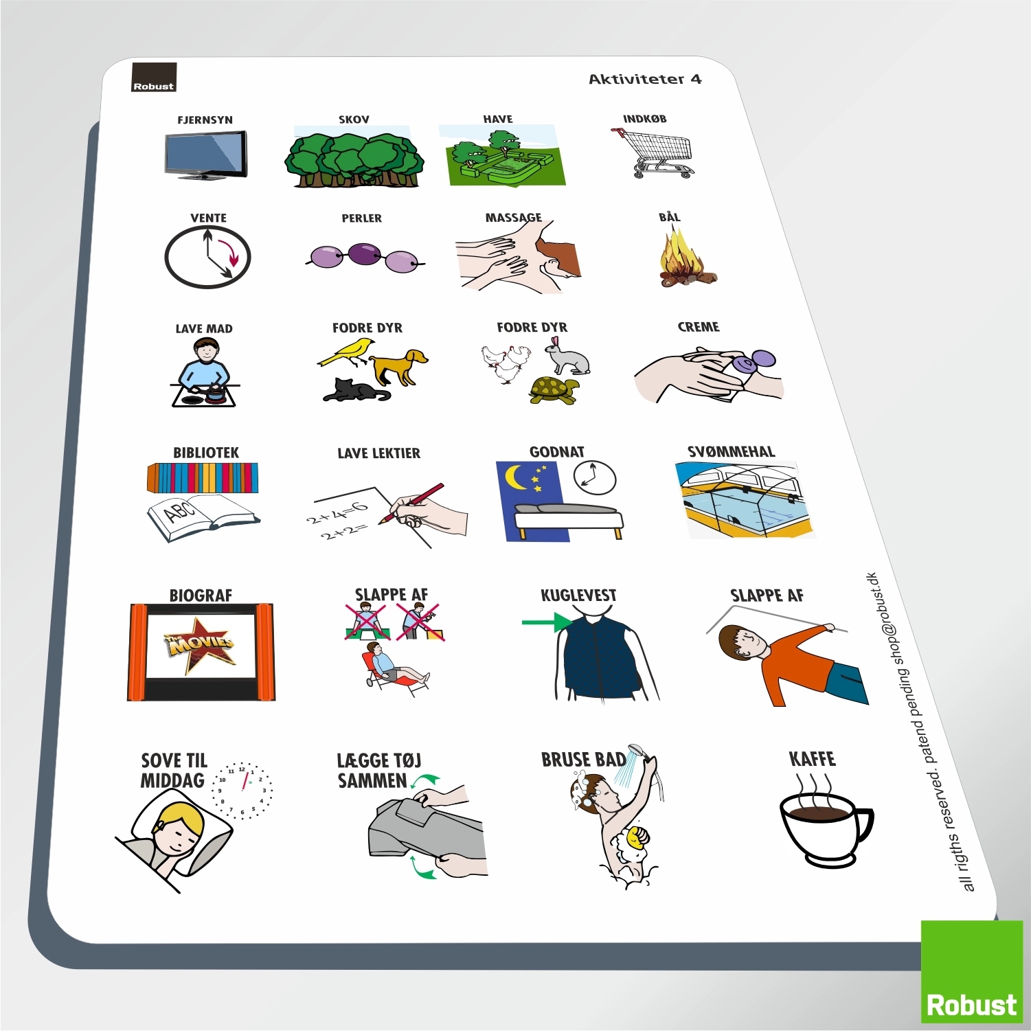 BEMÆRK: de enkelte piktogrammer er alle monteret med en velcropude på bagsiden, lige til at trække af piktogramarket, og bruge på din Robust tavle eller ugeplan