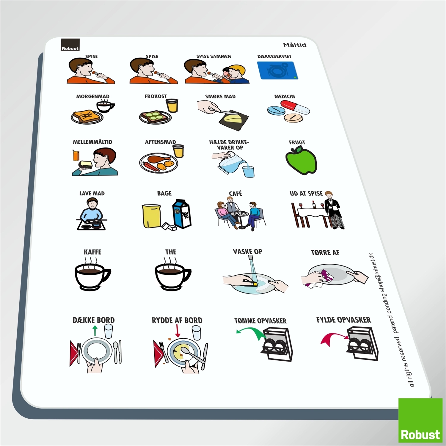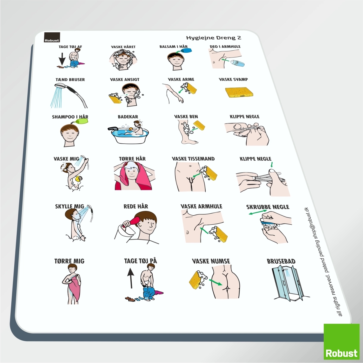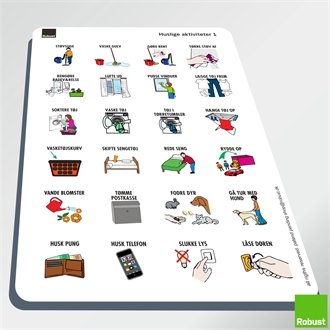 I denne pakke har vi sammensat det mest nødvendige for at komme i gang med visuel struktur i hjemmet. Pakken indeholder en ugeplan og de mest nødvendige piktogrammer, så du nemt kan planlægge en uge for et barn i skolealderen. Desuden er der piktogrammer til personlig pleje/hygiejne, transport, sundhed, tandlæge, måltider og fritidsaktiviteter. Da man kan kombinere de forskellige robustprodukter på kryds og tværs, kan man altid finde et produkt hvor ens piktogrammer kommer aller mest til sin ret. Måske i trives bedst med få piktogrammer af gangen, placeret i vores FlipFlap, eller monteret på vores opgavefriser, som i så kan placere der hvor f.eks. en fast rutine skal indøves/trænes.