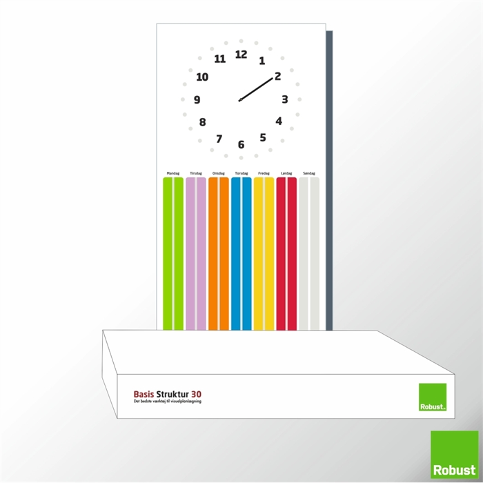 I denne pakke får du lidt mere af det hele, incl. Vores klassiske Robust ur, som gør det nemt at visualisere hvornår noget skal ske. Ud for et valg tidspunkt, kan i placere piktogrammer som viser hvad der skal ske. På den måde kan f.eks. et barn nemmere overskue hvordan dagen skal forløbe, og ikke mindst, hvornår og i hvilken rækkefølge.