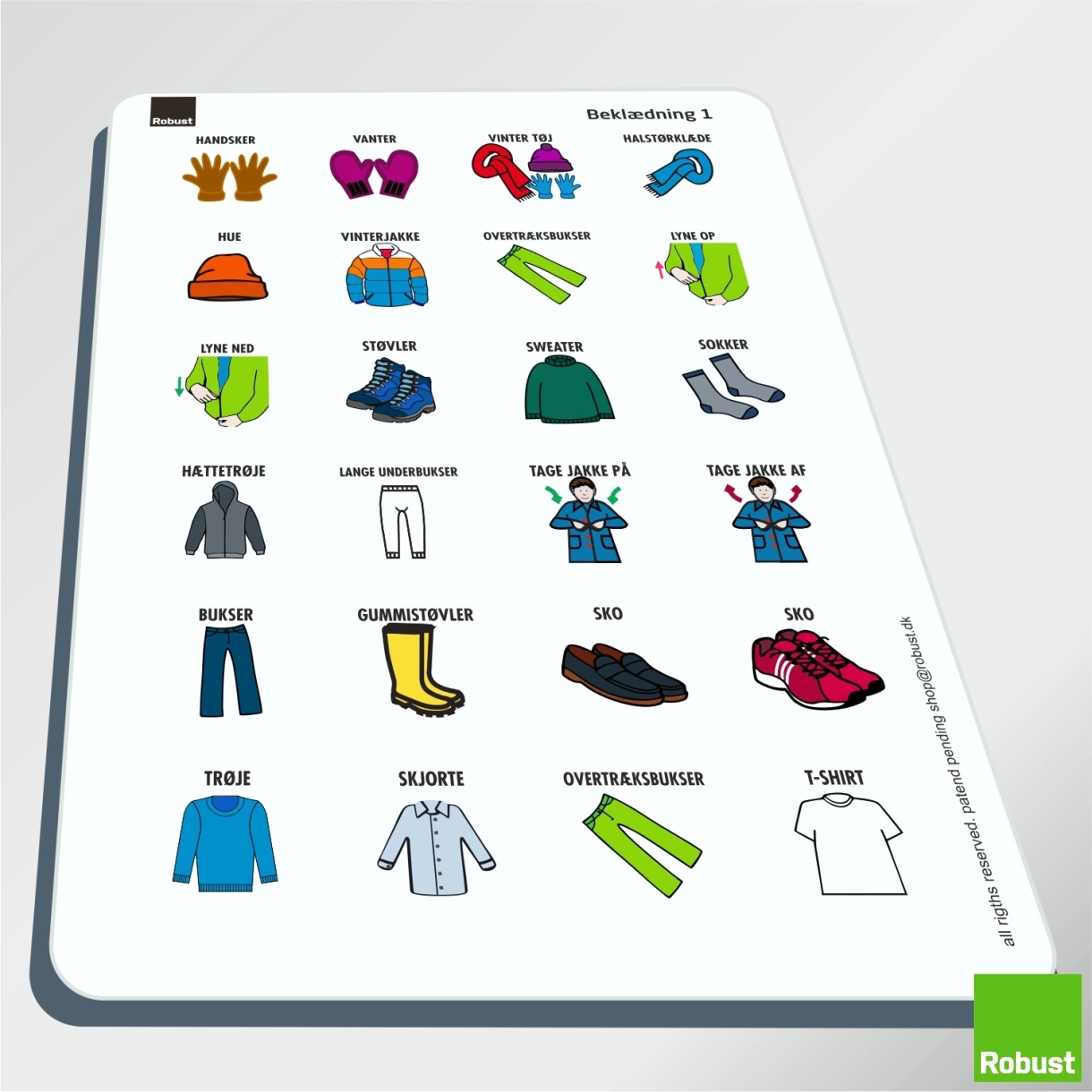 BEMÆRK: de enkelte piktogrammer er alle monteret med en velcropude på bagsiden, lige til at trække af piktogramarket, og bruge på din Robust tavle eller ugeplan