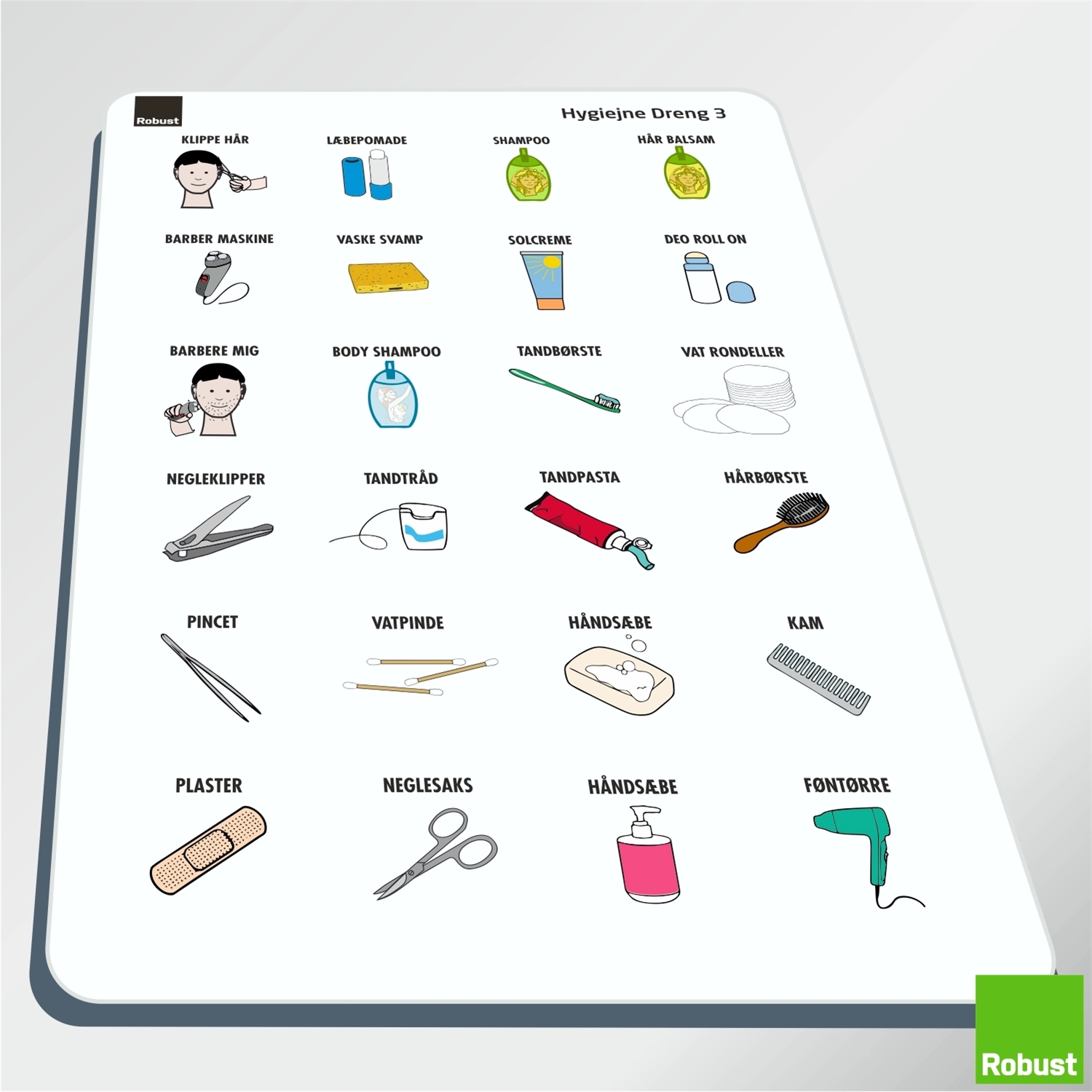 BEMÆRK: de enkelte piktogrammer er alle monteret med en velcropude på bagsiden, lige til at trække af piktogramarket, og bruge på din Robust tavle eller ugeplan