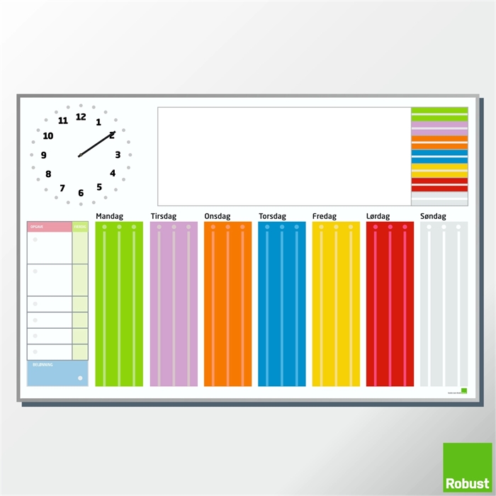 Vores Familietavle til tre personer med vores velkendte Robust ur, hvor du kan placere piktogrammer på de fastmonterede velcropuder. Omkring uret placerer man de piktogrammer som illustrerer de opgaver der skal laves, på de konkrete tidspunkter. På denne måde, kan man f.eks. sætte ?skole? piktogrammet på kl. 9.00., ?frokost? kl. 12.00 osv., det giver barnet et visuelt overblik over dagen, så barnet ved hvad dagen bringer.