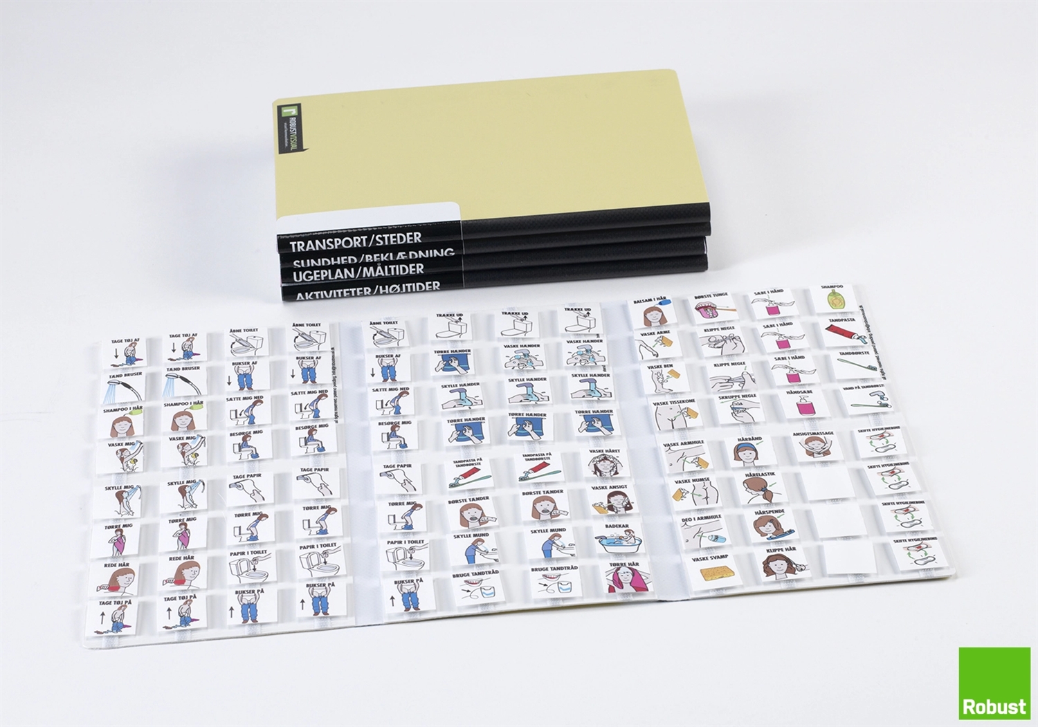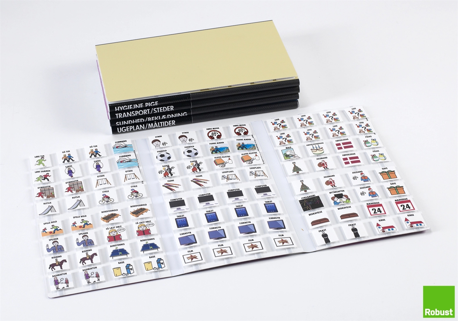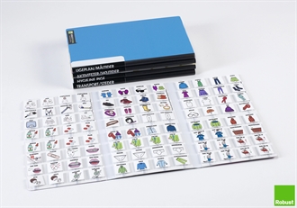 Indeholder 469 piktogrammer, 2 montageplader, 1 opgave/færdig plade dobbelt, 1 Dayplanner, 1 FlipFlap 4, 2 FlipFlap 6, 1 FlipFlap 8, 5 StoreBoards til opbevaring af piktogrammer.