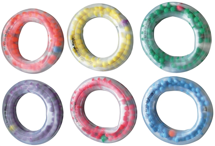 Grab-N-Rings er alsidige sanseringe, der kan bruges til mange forskellige aktiviteter. Når de er fuldt oppustede, kan de kastes, trilles, jongleres eller bruges som frisbee-lignende ringe. De er fyldt med små PVC-kugler og en smule ikke-giftig gel, som får kuglerne til at bevæge sig lydløst rundt og skabe en beroligende, taktil fornemmelse.