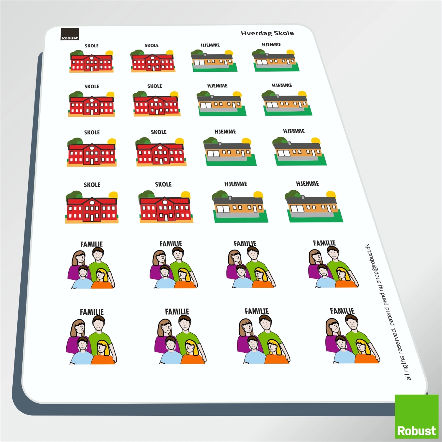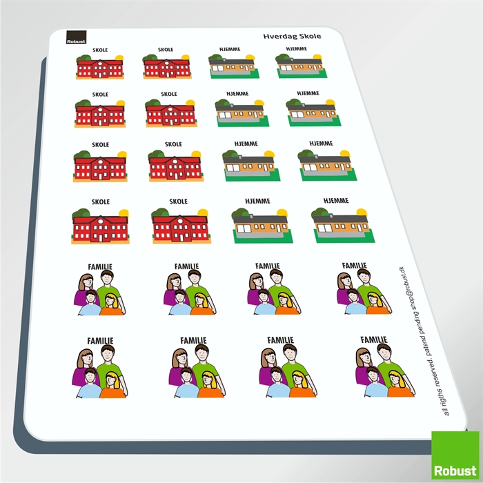 BEMÆRK: de enkelte piktogrammer er alle monteret med en velcropude på bagsiden, lige til at trække af piktogramarket, og bruge på din Robust tavle eller ugeplan