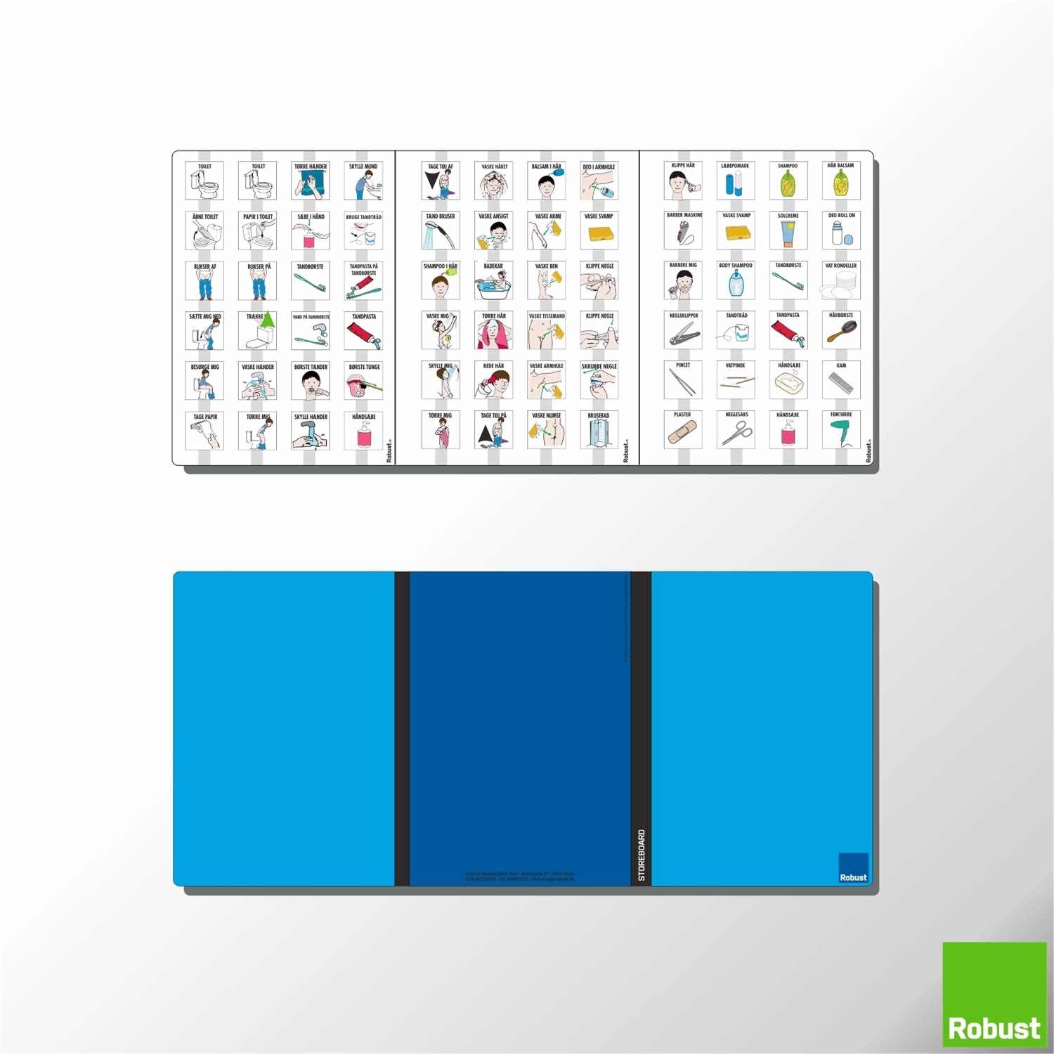 Pakken indeholder: 144 Robust specialdesignede piktogrammer, 2 stk. Robust original StoreBoard (piktogrammer er monteret og klar til brug), FlipFlap 4 + FlipFlap 8, Opgavefrise, Opgavefrise +, 2 stk. Montagefrise, montagefrise - dobbelt.