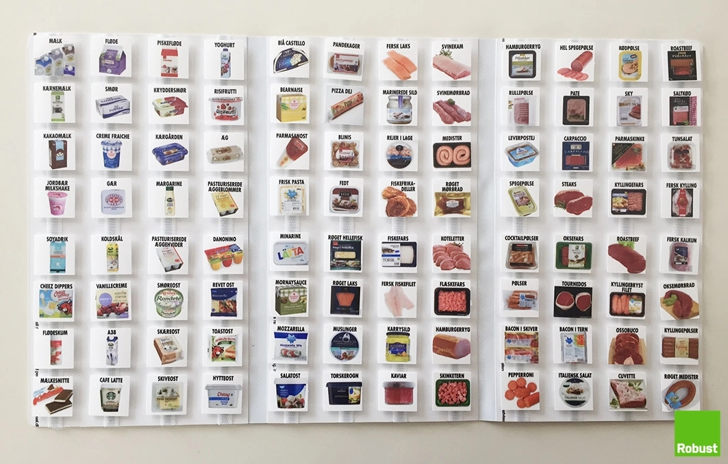 Indeholder: 480 basis piktogrammer I vandfaste materialer og med let genkendelige billeder, 1 Indkøbs bog til strukturering af en indkøbsliste, 5 StoreBoards til opbevaring af piktogrammer.