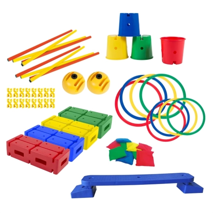 Sættet indeholder mange forskellige elementer, som gør det nemt at variere aktiviteterne. Her kan der arbejdes med balance, hop, koordination, kast og præcision – alt sammen på en legende og motiverende måde.