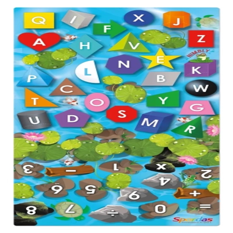 Barnet bevæger sig rundt på måtten som en “frø” og skal finde det rigtige svar ved at hoppe hen til det korrekte felt. De medfølgende kort bruges til at styre opgaver og sværhedsgrad, så legen kan udvikle sig i takt med barnets niveau.