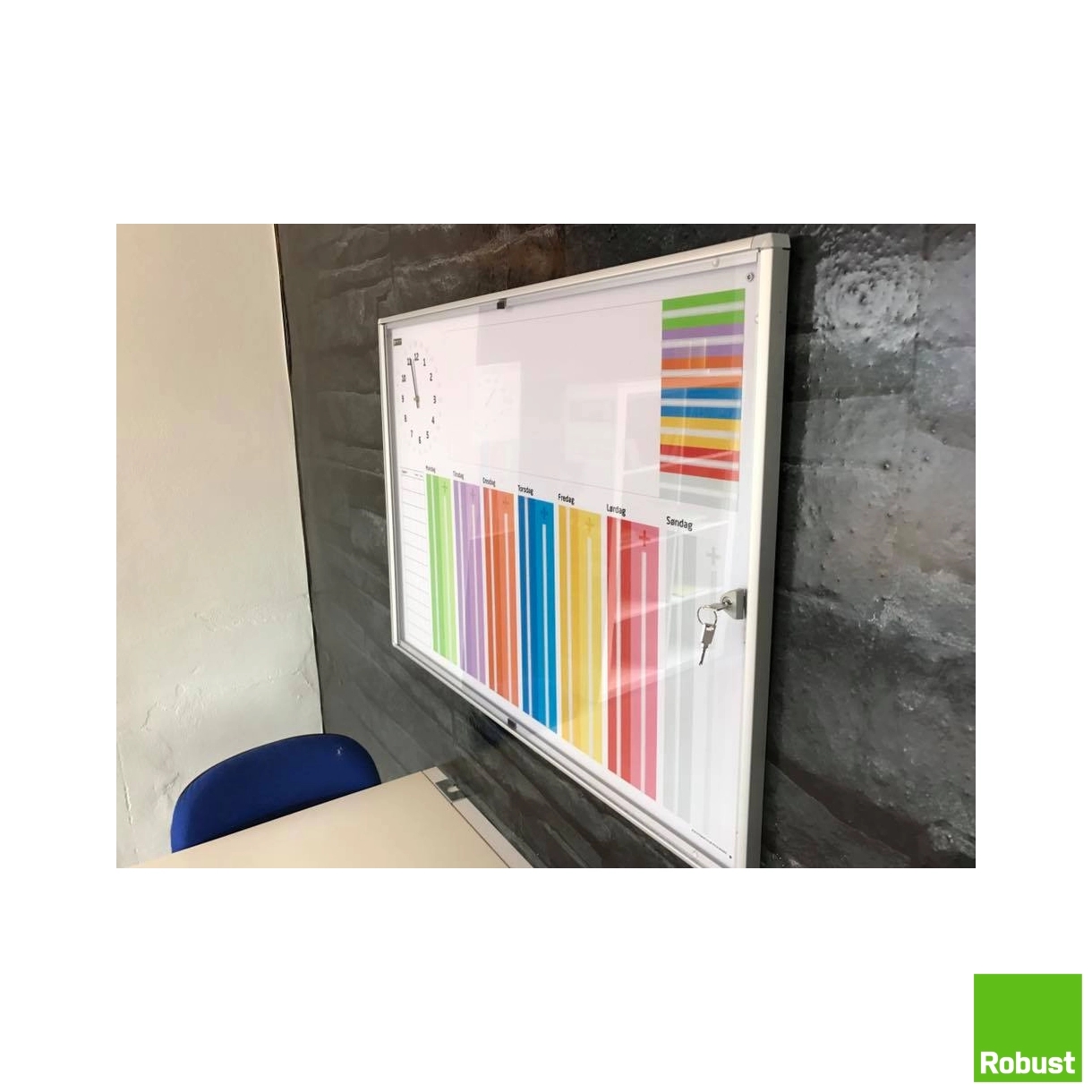 Tavlens front består af en højre hængslet klar akryl plade, som kan låses op med de tilhørende nøgler. Meget brugt til f.eks. institutioner, hvor man skal hindre, at uvedkommende har adgang til tavlen.