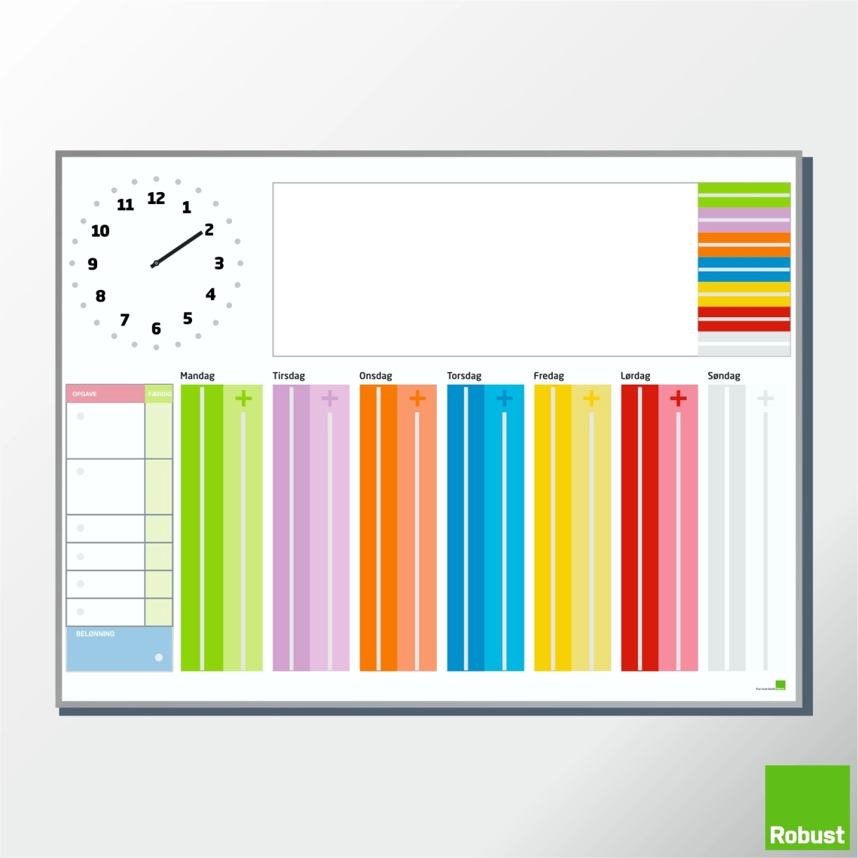 Vores Plus tavle til én person, med vores velkendte Robust ur, hvor du kan placere piktogrammer på de fastmonterede velcropuder. Omkring uret placerer man de piktogrammer som illustrerer de opgaver der skal laves, på de konkrete tidspunkter. På denne måde, kan man f.eks. sætte ?skole? piktogrammet på kl. 9.00., ?frokost? kl. 12.00 osv., det giver barnet et visuelt overblik over dagen, så barnet ved hvad dagen bringer.