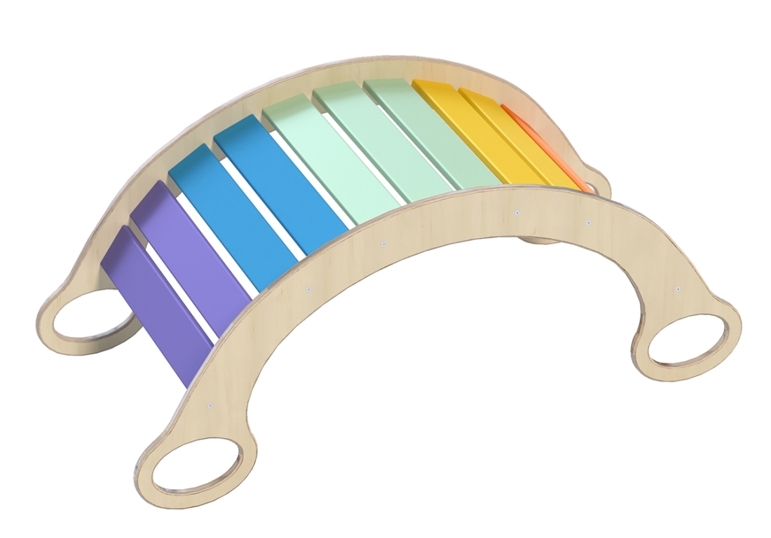 Rocking Klatrebue kombinerer leg, bevægelse og balance i ét multifunktionelt motorikmøbel. Den fungerer både som vippe og klatrestativ, og indbyder til aktiv leg, hvor børn kan kravle under, klatre over eller vippe frem og tilbage.