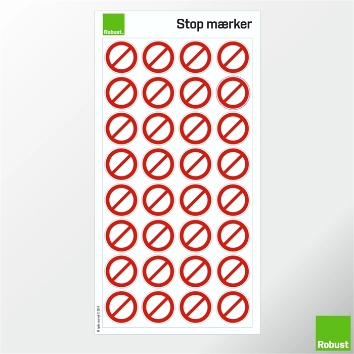 Mærkerne er gennemsigtige med rødt stop logo, de klæber på de fleste glatte overflader, og er nemme at montere og pille af igen.